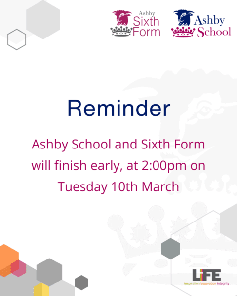 Ashby School and Sixth Form will finish early, at 2pm on Tuesday 10th March.