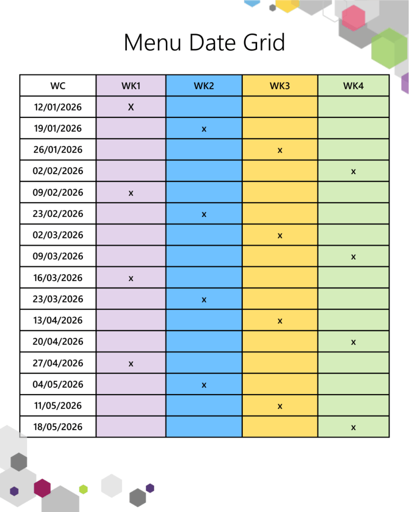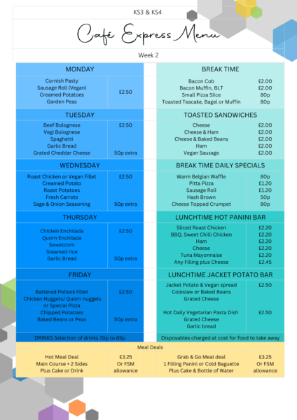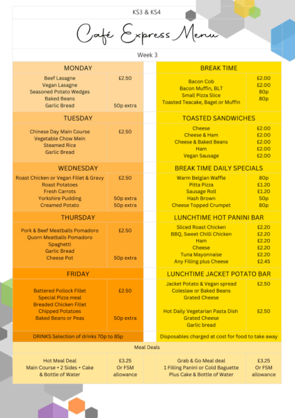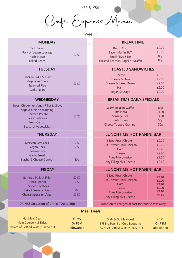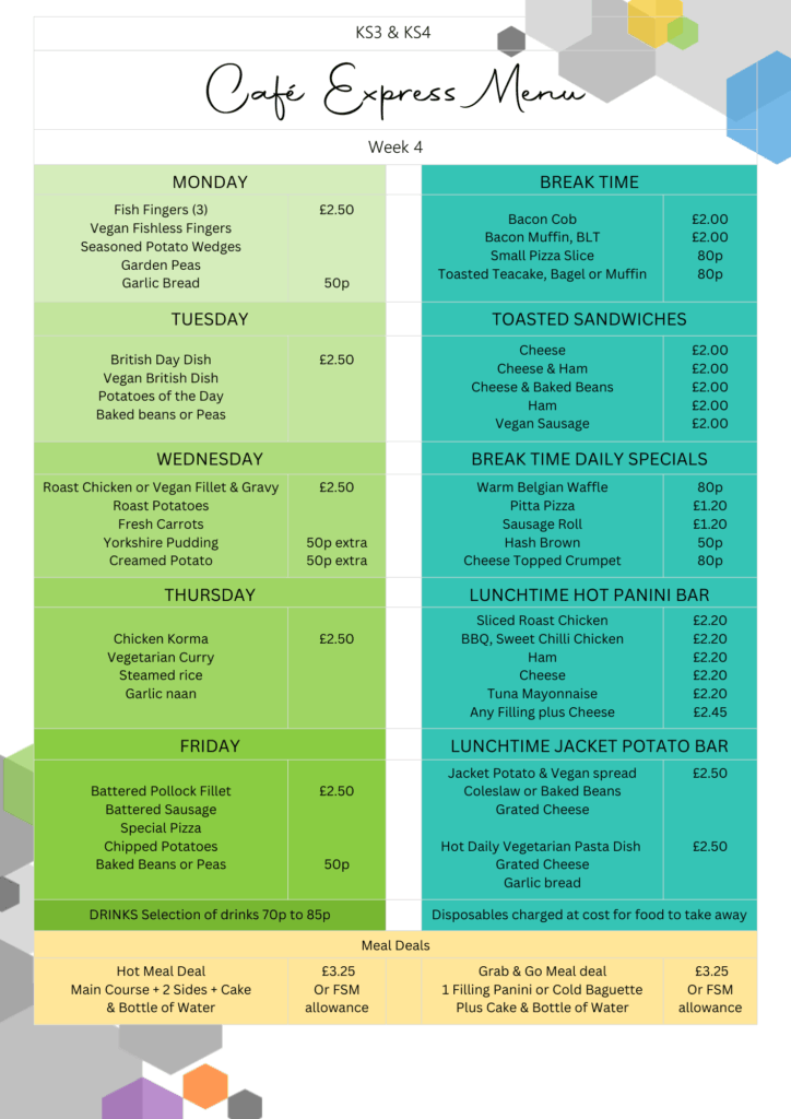 All students have a choice of two hot meal options, one of which is vegetarian. These follow a four-week rolling menu shown below. Hot meals are available individually but can also be purchased as part of a meal deal with a drink and a cake for the price of a free school meal voucher or £3.25.  Additional side items can be purchased for 50p.